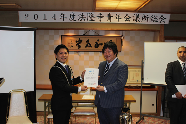 入会式においては新たに2名の入会者を迎え、総勢21名でのスタートを切りました。これからも新たな同志達を迎え、この地域に発信し続ける団体であるようメンバー一同がんばります。また、総会において2014年度理事長山嵜正登君より所信の表明があり、メンバーが足並みを揃え活動していく方向性を周知しました。